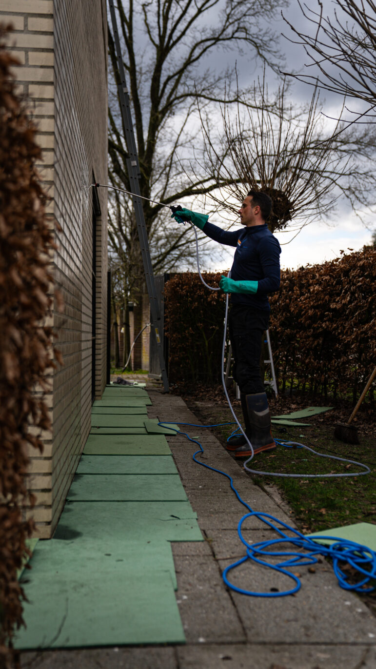 Nadat de gevel gereinigd is, brengen we standaard een mos- en algendoder aan. Deze behandeling pakt achtergebleven micro-organismen aan en helpt her-aanslag te vertragen.